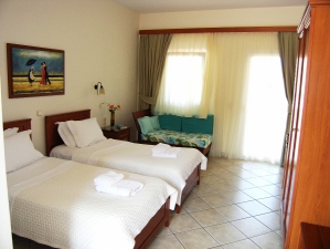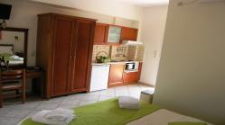 The studios for 2 people are double bedded and the studios for 3 people are twin bedded with an extra full sized sofa bed for a child, private bathroom facilities include a hair-dryer and each room has air-conditioning/heating and a safety deposit box. There is a well-equipped kitchenette with fridge, small oven with cooking rings, coffee machine or kettle. All rooms have SAT TV and spacious private terrace or balcony facing the swimming pool area mostly with wonderful views to the village and the surrounding area.