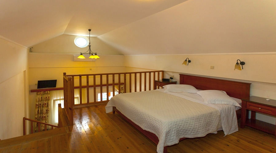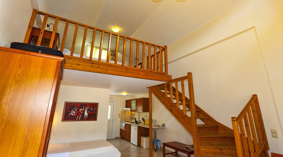 The maisonettes (2-4 people) are all located on the top floor and have all the same facilities as the studios. The maisonettes have a light and airy double bedroom on an open balcony above the kitchen and living/dining area that has one single bed and a full sized sofa bed.